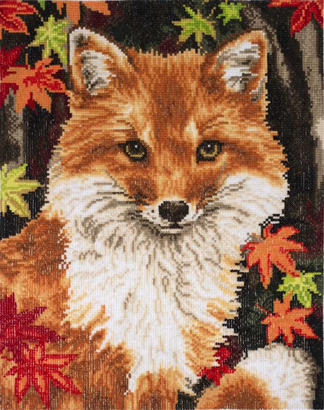 Fox cross stitch kit is a colourful design showing a red fox, surrounded by leaves against a dark background. This fox cross stitch kit is stitched on 11 count aida fabric using a colour chart with overlaid symbols.
